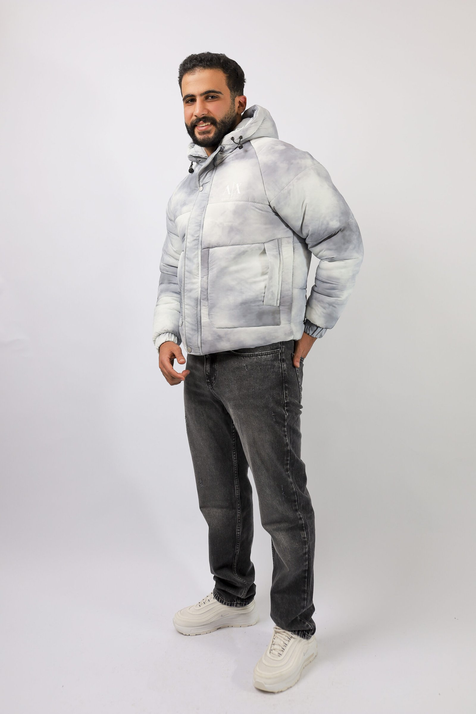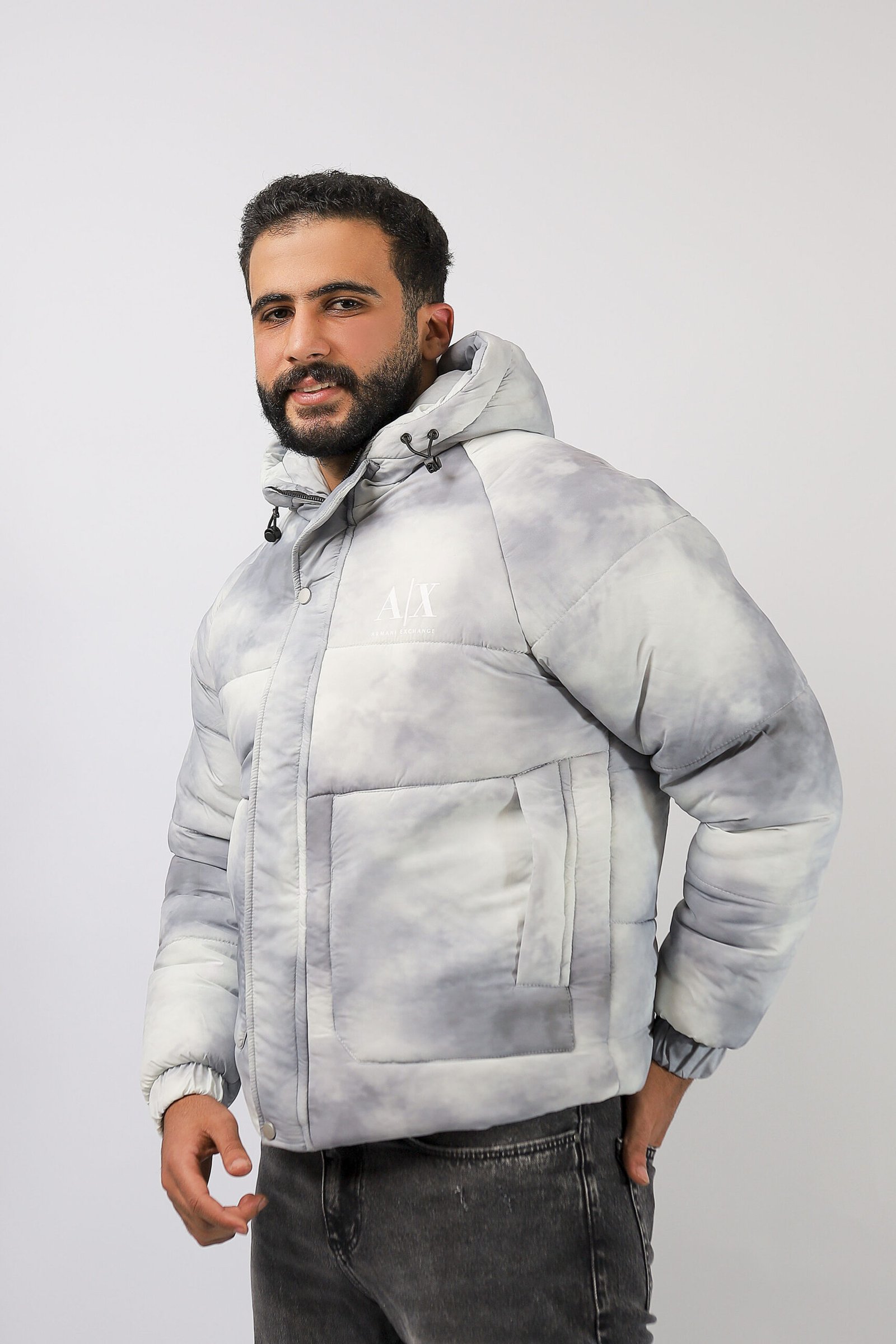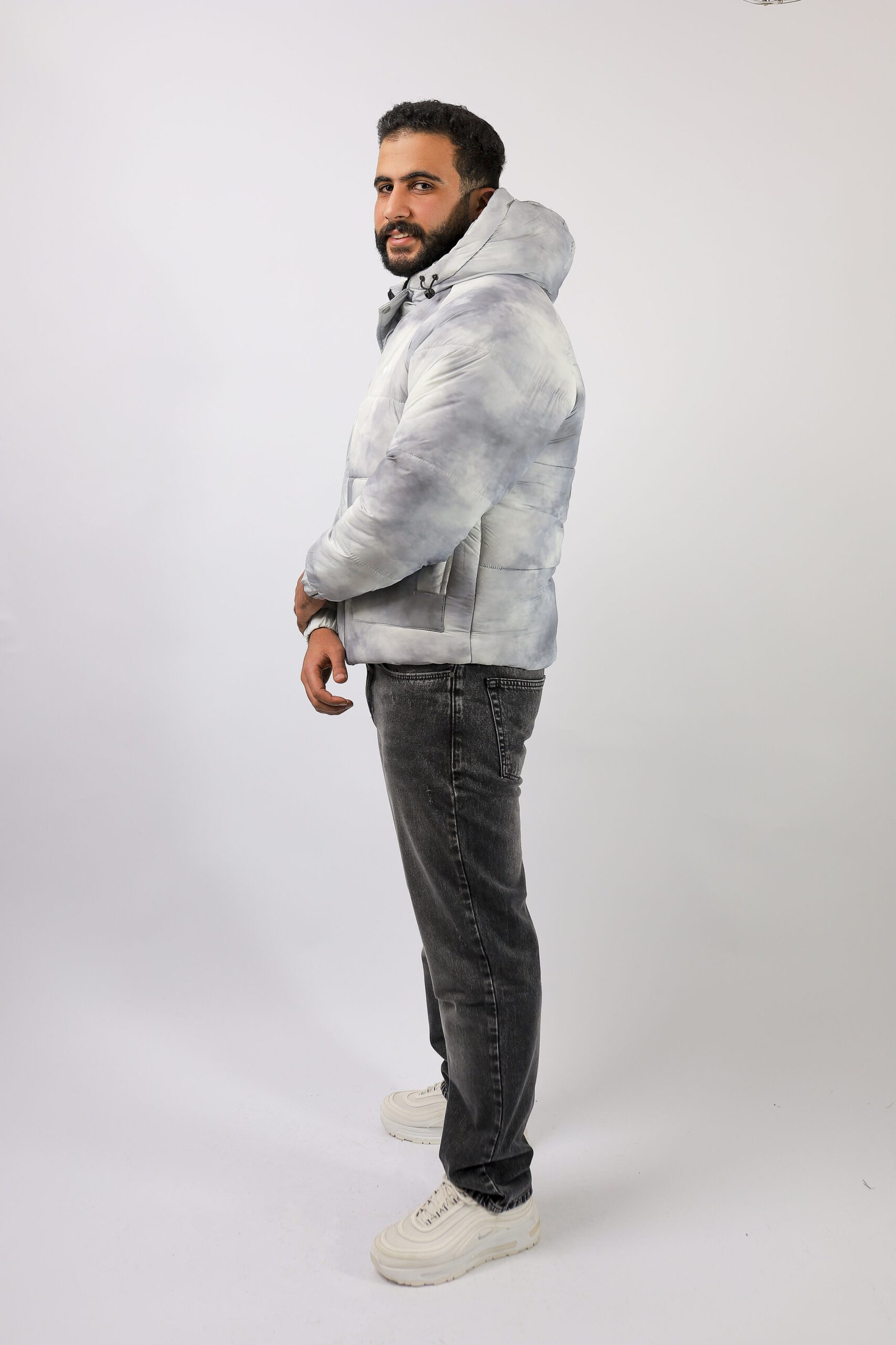 جاكيت رجالي شتوي مبطن بتصميم رمادي ثلجي بتدرجات دخانية (ستايل Cloud / Marble) يعطي شكل عصري وهادئ في نفس الوقت. خامته دافية وخفيفة، مناسب للشتاء والخروجات اليومية بدون ما يحسسك إنك لابس “بطانية رسمية”.